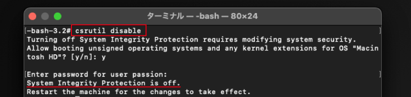 ・ターミナルで csrutil disable