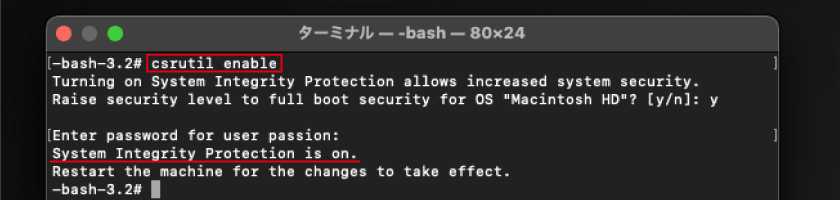 ターミナルで実行するコマンドは csrutil enable