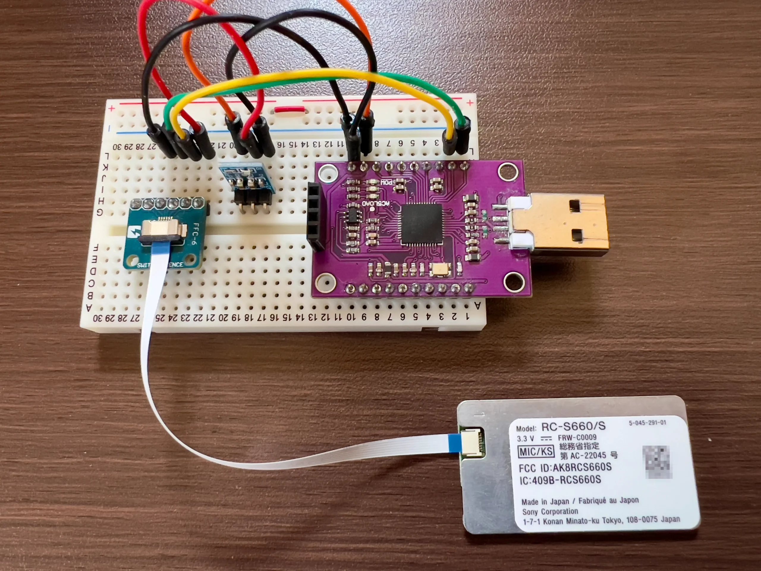 なお、 RC-S660/S のインターフェースは FPC / FFC 用コネクタであるため、ブレッドボードで使用できるようにするためにスイッチサイエンス社のピッチ変換基盤を使用しています。