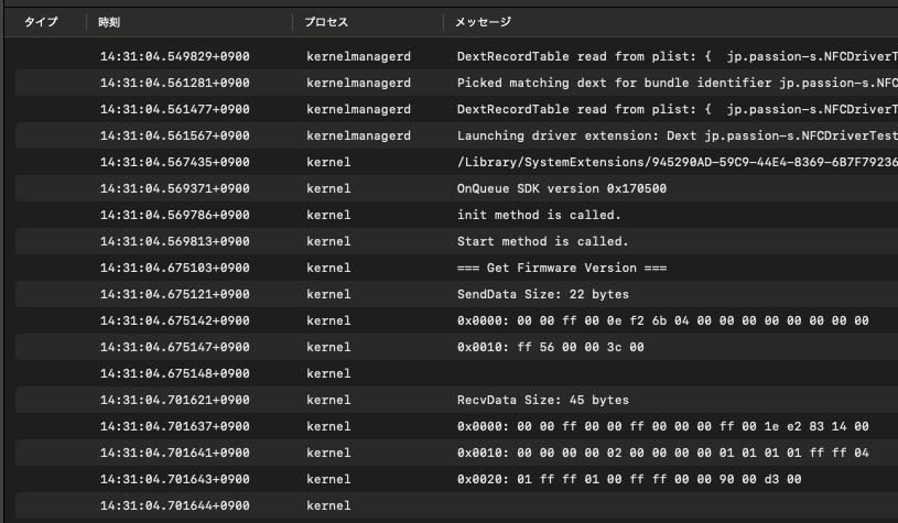 また、 FT232H を介して、目的である RC-S660/S と通信することもできました。