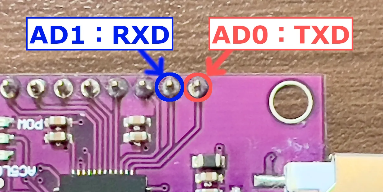 FT232H で該当するピンは、 TXD = AD0, RXD = AD1 となります。