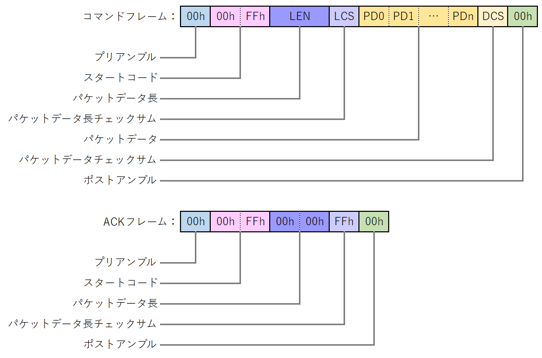 | 4 | パケットデータ長チェックサム | 1 | コマンドフレーム: パケットデータ長データ列のチェックサム ACKフレーム: FFh |