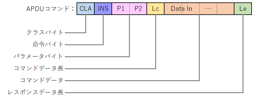 | 4 | コマンドデータ長 | Lc | 1 | (コマンドデータが存在する場合のみ)コマンドデータのバイトサイズ |