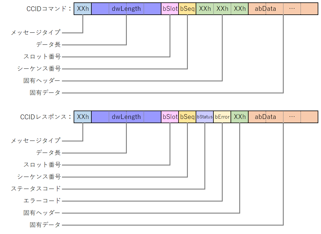 | 1 | メッセージタイプ | 1 | CCIDコマンドの種類を示す特定の値 |